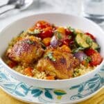 Keywords: 5-a-day, couscous, roasted vegetables, chicken thighs, healthy recipe, Mediterranean, easy dinner