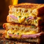 This Air-fryer Cheese & Ham Toastie is a quick and delicious sandwich perfect for a satisfying snack or light meal. Using the air fryer ensures a perfectly golden, crunchy exterior while melting the creamy cheese inside. The combination of mature cheddar or gruyère with English mustard and optional chives adds a burst of flavor, complemented by a thick slice of ham. Ready in just 10 minutes, it’s an easy recipe that elevates the classic toastie.