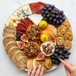 - Assemble the cheese board. Arrange the brie, goat cheese, and gjetost in the center of your serving board. Surround the cheeses with salami slices, baguette pieces, crackers, apple wedges, grapes, and figs, creating an inviting and colorful layout.