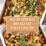 Keywords: breakfast strata, bacon strata, baked breakfast casserole, savory strata, spinach bacon casserole, make ahead breakfast