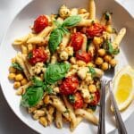 Keywords: baked feta, chickpeas, cherry tomatoes, Mediterranean pasta sauce, vegetarian dinner, easy baked feta recipe, creamy feta sauce, one-dish pasta sauce