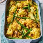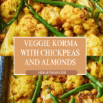 A comforting and flavorful baked veggie korma featuring roasted cauliflower, spring onions, chickpeas, and green beans in a creamy coconut sauce with mild korma paste and ground almonds. This easy oven-baked curry pairs perfectly with basmati rice or naan and a side of mango chutney for a satisfying vegetarian meal.