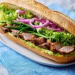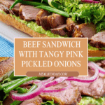 This beef sandwich with pink pickled onions offers a flavorful and refreshing twist on a classic sandwich, combining tender leftover beef, vibrant green beans, creamy avocado sauce, and tangy pink pickled onions inside a demi baguette. Perfect for a quick lunch or light dinner, this recipe uses simple, leftover ingredients to create a delicious and satisfying meal.