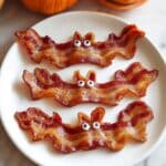 Keywords: Halloween breakfast, bacon bats, candied beef bacon, maple bacon, spooky breakfast, Halloween snack, candied bacon