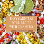 Keywords: carnitas bowl, mexican bowl recipe, cilantro lime rice, easy carnitas dinner, quick mexican bowls