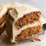 This Easy and Ultra Moist Carrot Cake features a tender crumb enriched with crushed pineapple, grated carrots, and warm cinnamon. Moist and flavorful, it is topped with a luscious cream cheese frosting, making it a perfect dessert for any occasion.