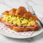 - Assemble the Croissants: Spread butter on both croissant halves to taste, add a slice of ham on each bottom half, then spoon the scrambled eggs over the ham.