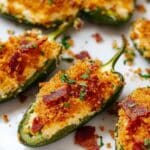 These Jalapeño Poppers are a delicious, spicy appetizer featuring fresh jalapeños stuffed with a creamy bacon and cheddar cheese filling, topped with crunchy panko breadcrumbs, then baked to perfection. Crispy bacon and a blend of sharp cheeses create a rich, savory flavor, balanced by the slight heat of jalapeños. Perfect for parties or a flavorful snack.