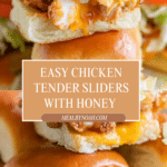 These Chicken Tender Sliders are a delicious and easy-to-make meal perfect for gatherings or a family dinner. Soft Hawaiian rolls are filled with juicy chicken tenders, melty cheese, and fresh veggies, all finished with a sweet and tangy honey mustard glaze.