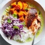 - Serve: Just before serving, fold the orange chunks into the slaw. On each plate or shallow bowl, place a side of rice and a dollop of aji verde. Flake the salmon over the rice, then top with a generous scoop of the orange salsa. Enjoy!