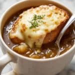 A classic French Onion Soup recipe featuring slowly caramelized onions simmered in rich beef broth, topped with cheesy toasted baguette slices for a warming and flavorful meal.