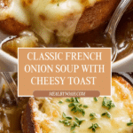 Keywords: French Onion Soup, caramelized onions, beef broth soup, cheesy toast soup, classic French soup