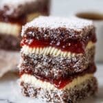 Classic Australian Lamingtons featuring soft buttery sponge cake squares dipped in rich chocolate icing and rolled in desiccated coconut. Served traditionally with a dollop of strawberry jam and whipped cream, perfect for tea time or special occasions.