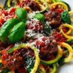 A healthy and delicious Courgetti Bolognese featuring lean turkey mince and a rich vegetable-packed tomato sauce served over fresh courgette noodles, topped with grated pecorino and fresh basil. This low-carb, flavorful dish is perfect for those seeking a lighter alternative to traditional pasta Bolognese.