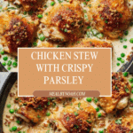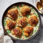 This creamy chicken stew is a comforting, flavorful dish featuring tender chicken thighs cooked with soft leeks, Dijon mustard, crème fraîche, and sweet peas, topped with a crispy parsley and breadcrumb crust grilled to golden perfection. Perfect for a cozy family meal, this recipe combines gentle stovetop cooking with a final grill to finish.