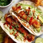 - Assemble Tacos and Serve: Remove the chicken and tortillas from the oven. To assemble, place warm tortillas on plates, add a generous portion of taco slaw, two slices of avocado, one or two chicken fingers, drizzle with sriracha, and sprinkle with chopped coriander. Enjoy immediately!