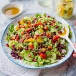 This vibrant Crunchy Chopped Salad combines the fresh flavors of cherry tomatoes, cucumber, Little Gem lettuces, and peppery cress with the sweetness of pomegranate seeds and a tangy homemade lemon vinaigrette. Topped with crunchy sunflower and pumpkin seeds, it’s the perfect refreshing salad that’s quick to prepare and easy to customize with your favorite veggies.