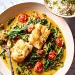 - Add Spinach and Cod: Stir in 160g baby spinach until it begins to wilt. Carefully place 2 skinless cod loins on top of the curry, spoon some sauce over or gently tuck the fish under the sauce. Cover and cook for an additional 5 to 8 minutes, or until the cod is just cooked through and flakes easily.