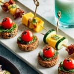 - Assemble the Bites: Spear the mango and cucumber skewers into the side of 12 fishcakes. For the other 12 fishcakes, spear the cherry tomato and coriander topped skewers through the top, creating colorful and tasty bite-sized snacks perfect for sharing or entertaining.