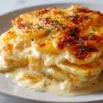 This delicious scalloped potatoes recipe creates a creamy, cheesy, and comforting dish perfect for any meal. Layers of thinly sliced Yukon Gold or Russet potatoes are baked with sautéed onions and a rich cream sauce made from butter, milk, and cheese. The gratin comes together with a golden, bubbly top and tender potatoes inside, ideal as a hearty side or main dish. The recipe also offers a dairy-free option using vegan cheese and non-dairy milk, making it versatile for various dietary preferences.