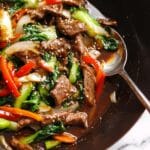 Keywords: Chinese beef stir fry, quick beef recipe, velveting beef, easy stir fry, Chinese cooking wine, bok choy stir fry, peanut oil stir fry