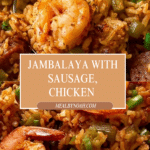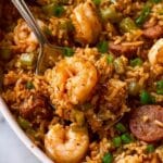 Keywords: Jambalaya, Cajun recipe, Creole rice dish, andouille sausage jambalaya, baked jambalaya, chicken and shrimp jambalaya, easy jambalaya