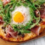 These pizzas are best eaten fresh to enjoy the crispy texture of the wraps and the runny egg yolk. If you need to store leftovers, refrigerate them in an airtight container for up to 1 day. Reheat gently in a low oven to help keep the wraps crisp, but note the egg may become firmer.