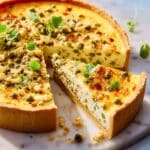 A delightful and savory Feta & pea tart featuring a crisp homemade pastry crust, a creamy filling of crème fraîche, feta cheese, peas, and fresh herbs baked to golden perfection. Perfect as a light lunch or dinner, served warm or cold with an optional green salad.