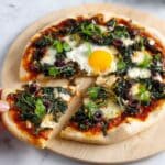 This Florentine dairy-free pizza features a homemade thin crust topped with a rich tomato and garlic sauce, vibrant spinach, and an assortment of your favorite toppings. Finished with perfectly baked eggs, fresh basil, rocket, and a splash of lemon juice, this recipe offers a deliciously fresh and satisfying dairy-free alternative to traditional pizza.
