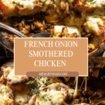 A comforting and flavorful French Onion Smothered Chicken recipe featuring tender thin-cut chicken breasts simmered in a rich caramelized onion, mushroom, and herb sauce, topped with toasted French bread and melted Gruyere cheese for an irresistible baked finish.