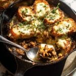 French Onion Smothered Chicken is a comforting and flavorful dish that combines tender chicken breasts with rich caramelized onions, earthy mushrooms, and a creamy sauce. Topped with toasted French bread and melted Gruyère cheese, this meal feels indulgent yet is simple enough for weeknight dinners.