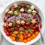 This vibrant tomato salad combines juicy cherry tomatoes, creamy mozzarella, and fresh basil with a tangy homemade dressing. It’s a refreshing and simple dish perfect for warm days or as a colorful side for any meal.