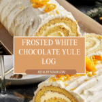 This Frosted White Chocolate Yule Log is a festive dessert featuring a light vanilla sponge rolled with tangy clementine curd and vanilla Chantilly cream. The log is beautifully finished with a creamy white chocolate buttercream frosting, delicate tree-like markings, and festive clementine zest garnishes, making it a perfect centerpiece for holiday celebrations.