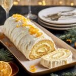 This Frosted White Chocolate Yule Log is a festive dessert featuring a light vanilla sponge rolled with tangy clementine curd and vanilla Chantilly cream. The log is beautifully finished with a creamy white chocolate buttercream frosting, delicate tree-like markings, and festive clementine zest garnishes, making it a perfect centerpiece for holiday celebrations.