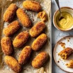 Glamorgan sausages are a delicious vegetarian Welsh specialty made from leeks, cheese, and breadcrumbs, coated in flour, egg, and more breadcrumbs, then fried and oven-baked to achieve a crispy golden crust. Perfect as a savory snack or main dish, these sausages are flavorful and satisfying with a lovely thyme and mustard kick.