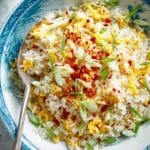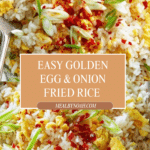 A vibrant and flavorful golden egg and onion fried rice recipe featuring fluffy long-grain rice, scrambled eggs, and a perfect balance of soy and sesame oils, finished with a hint of chilli for a delightful, quick, and easy meal.