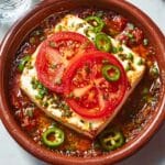 Greek Bouyiourdi is a traditional spicy baked feta and tomato dish bursting with Mediterranean flavors. This warm, comforting appetizer combines ripe tomatoes, garlic, feta cheese, green chili, oregano, and olive oil, baked to luscious perfection and served with warm pitta bread for dipping.