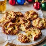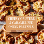 Delicious homemade pretzels filled with sweet caramelised onions and topped with melted Gruyère cheese. These soft, golden-brown pretzels combine the rich flavors of caramelised onions and nutty Gruyère for a perfect snack or appetizer, with a slightly crispy exterior from a bicarbonate of soda bath before baking.