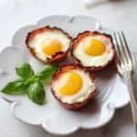 - Season and Garnish: Once baked, season each ham and egg cup with salt and freshly ground black pepper according to your taste. Garnish with fresh basil leaves if desired before serving.
