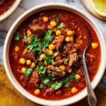 Keywords: Harira, Moroccan soup, beef stew, chickpeas, lentils, tomato stew, North African cuisine, hearty soup, spiced stew