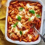 - Garnish and Serve: Remove the pasta bake from the oven, scatter with extra fresh basil leaves if desired, and serve hot.