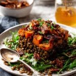 A vibrant and flavorful Honey-Cinnamon Pumpkin Lentil Salad that combines roasted spiced pumpkin, honey-glazed walnuts, peppery rocket, and tender lentils. This hearty yet fresh dish is enhanced by a warm, aromatic dressing with hints of cinnamon, allspice, and ginger, perfect for a nutritious lunch or light dinner.