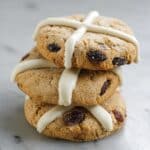 Deliciously spiced Hot Cross Cookies combining the classic flavors of cinnamon, sultanas, and white chocolate. These soft and golden cookies are topped with a delicate white chocolate cross, perfect for festive occasions or a sweet treat any time of year.