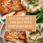 This Italian garlic chicken with white bean and rosemary mash is a deliciously crispy pan-fried chicken thigh dish coated in a flavorful breadcrumb and parmesan crust, served with a creamy, fragrant white bean mash infused with rosemary and fresh lemon. It’s a hearty, satisfying meal ideal for a comforting dinner with a touch of rustic Italian charm.