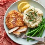 This Italian garlic chicken with white bean and rosemary mash is a deliciously crispy pan-fried chicken thigh dish coated in a flavorful breadcrumb and parmesan crust, served with a creamy, fragrant white bean mash infused with rosemary and fresh lemon. It’s a hearty, satisfying meal ideal for a comforting dinner with a touch of rustic Italian charm.