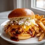 These juicy BBQ chicken sliders are a perfect crowd-pleaser for any occasion. Tender chicken breasts soaked in tangy barbecue sauce, topped with melted cheddar and fresh coleslaw on soft slider buns, served alongside crispy homemade fries. A delicious, easy-to-make meal everyone will love.