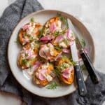 - Assemble and Serve: Top each sweet potato with a generous dollop of the creamy yogurt sauce. Garnish with thinly sliced fresh radishes, Lena’s Kitchen pickled onions, and finely chopped fresh herbs. Serve immediately and enjoy!