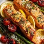 This easy and healthy Lemon Garlic Salmon Tray Bake features tender salmon fillets marinated in a zesty lemon garlic paste, grilled alongside fresh asparagus and juicy cherry tomatoes. Perfect for a quick, nutritious meal, this recipe combines vibrant flavors and minimal prep, finishing with a sprinkle of parmesan and fresh parsley for an elegant touch.