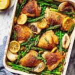 Keywords: lemon roasted chicken, spring chicken recipe, roasted asparagus and chicken, lemon garlic chicken, one pan chicken dinner