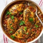 This lighter chicken cacciatore is a flavorful and satisfying dish that brings the classic Italian flavors to your table with less fat. Tender chicken breasts simmered in a rich tomato sauce with mushrooms, herbs, and crispy prosciutto make for a comforting meal any night of the week.